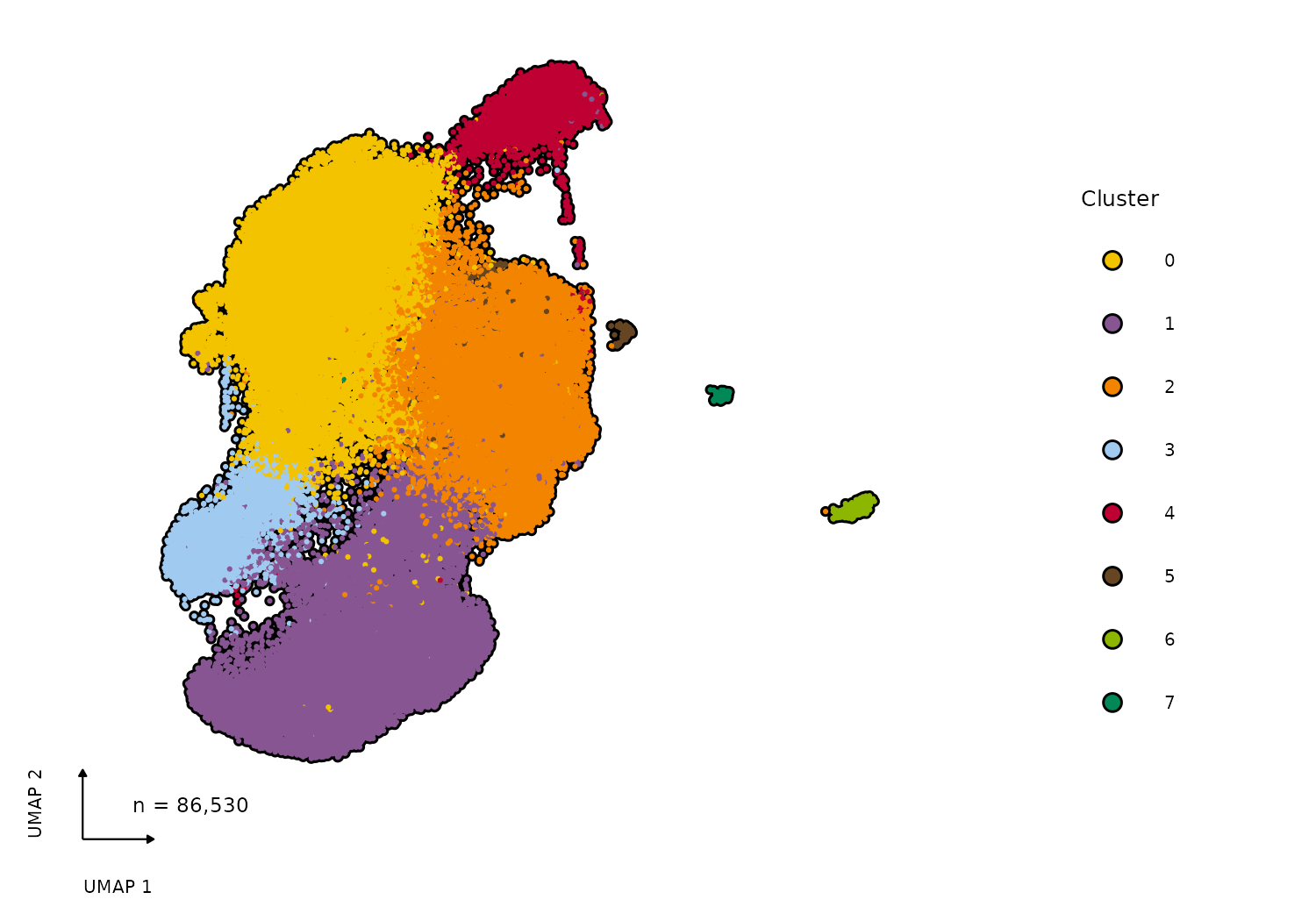 Uniform Manifold Approximation and Projection of single-cell expression data. Has a fancy black outline around all points!
